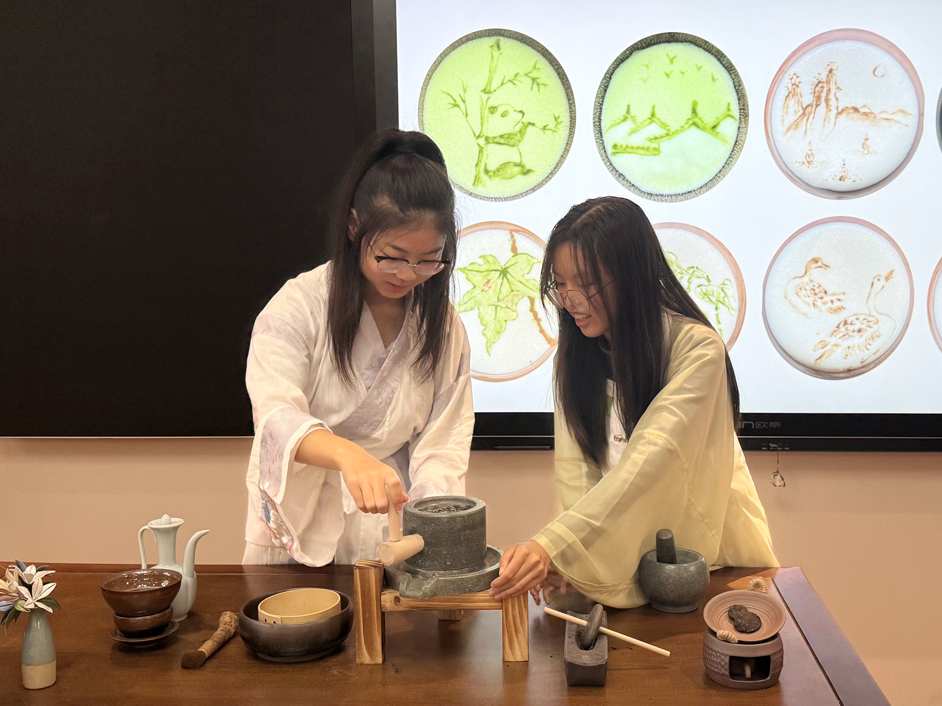 活动伊始,冯晓玉老师首先为同学们讲解了汉服的典型特征,如“交领右衽”与“上衣下裳”所蕴含的礼制与美学。随后,她细致展示了宋代点茶核心器皿“十二先生”的使用方法。在实践环节,同学们一步步调试茶膏、有序注水、击拂茶汤,盏中洁白绵密的沫饽宛如飞雪。最后,大家在“雪沫”之上勾勒线条、点染图案,完成了一幅幅独具匠心的“茶百戏”,亲身体验了“水丹青”的灵动意趣。