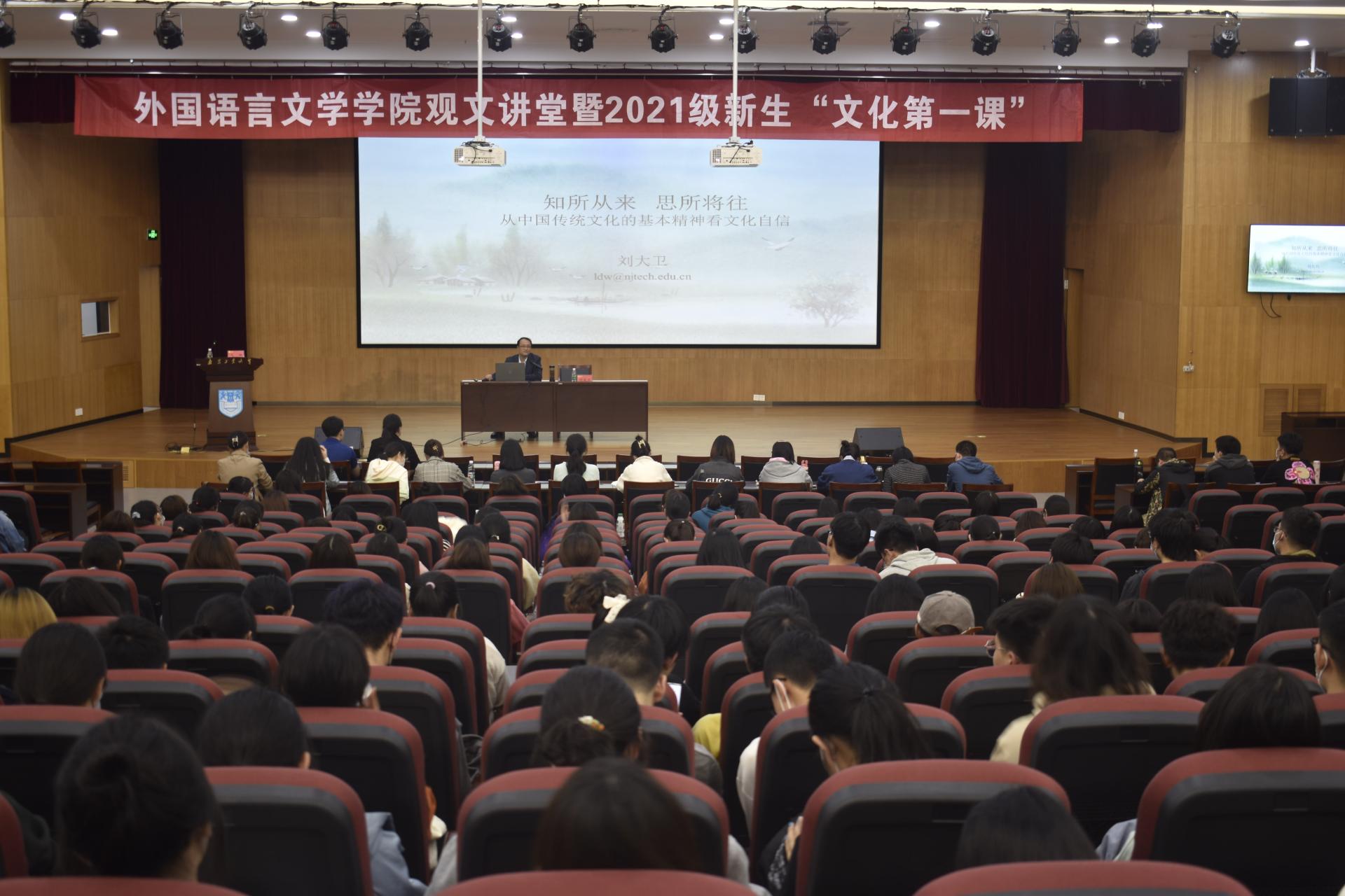 国民之魂,文以化之;国家之神,文以铸之。为激励广大青年学子继承中国传统文化,弘扬时代精神,11月3日下午,外国语言文学学院特邀校党委常委、党委办公室主任刘大卫老师做客第三期“观文讲堂”暨2021级新生“文化第一课”。“观文讲堂”由院党委书记弋鹏主持,院党委副书记高洁、辅导员王鑫及200余名新生参加了讲座。