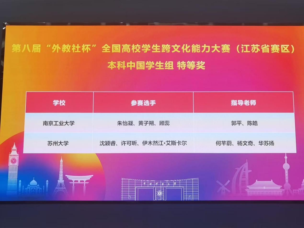 10月26日,第八届“外教社杯”全国高校学生跨文化能力大赛江苏省赛区在中国矿业大学举行。我校代表队不负众望,在群雄逐鹿中勇夺决赛小组头名,成功斩获特等奖,第六次蝉联该项赛事最高荣誉。