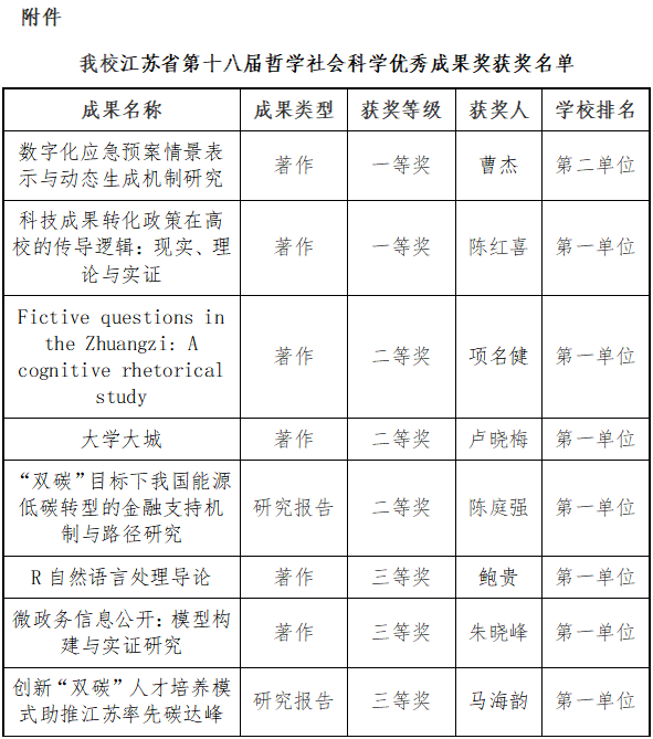 12月26日至27日,江苏省哲学社会科学界第十次代表大会在南京召开,会议宣读了《省政府关于公布江苏省第十八届哲学社会科学优秀成果奖的决定》(苏政发〔2025〕106号),我院项名健副教授的著作《Fictive questions inthe Zhuangzi: Acognitive rhetoricalstudy》荣获二等奖,鲍贵教授的著作《R自然语言处理导论》荣获三等奖。